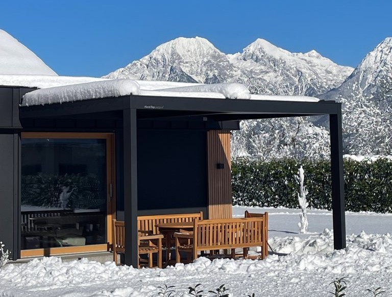 Hard-Top pergola zadrži do en meter snega. To pomeni, da lamel ob sneženju ni treba odpirati, zato terasa ostane suha, hkrati pa vam prihrani panično čiščenje strehe ob vsakem snežnem metežu.